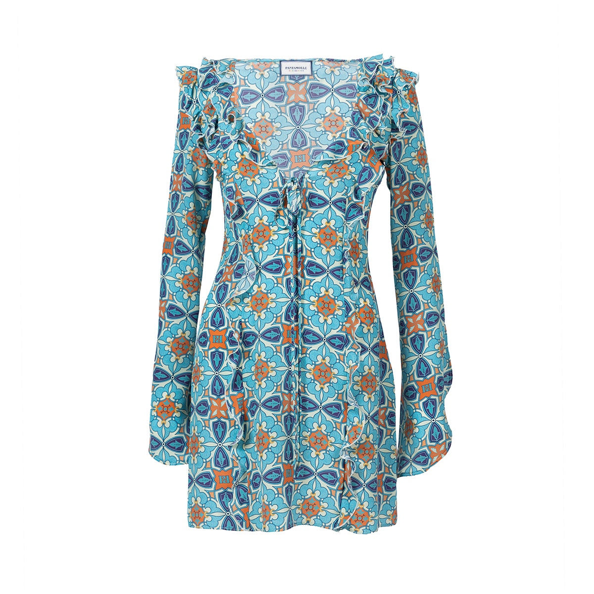 Pantamolle continua la sua sperimentazione per il guardaroba femminile. Realizzato con un esclusivo crepe in seta, questo abito fluido è arricchito da eleganti ruches che gli donano movimento e una silhouette ultra femminile.