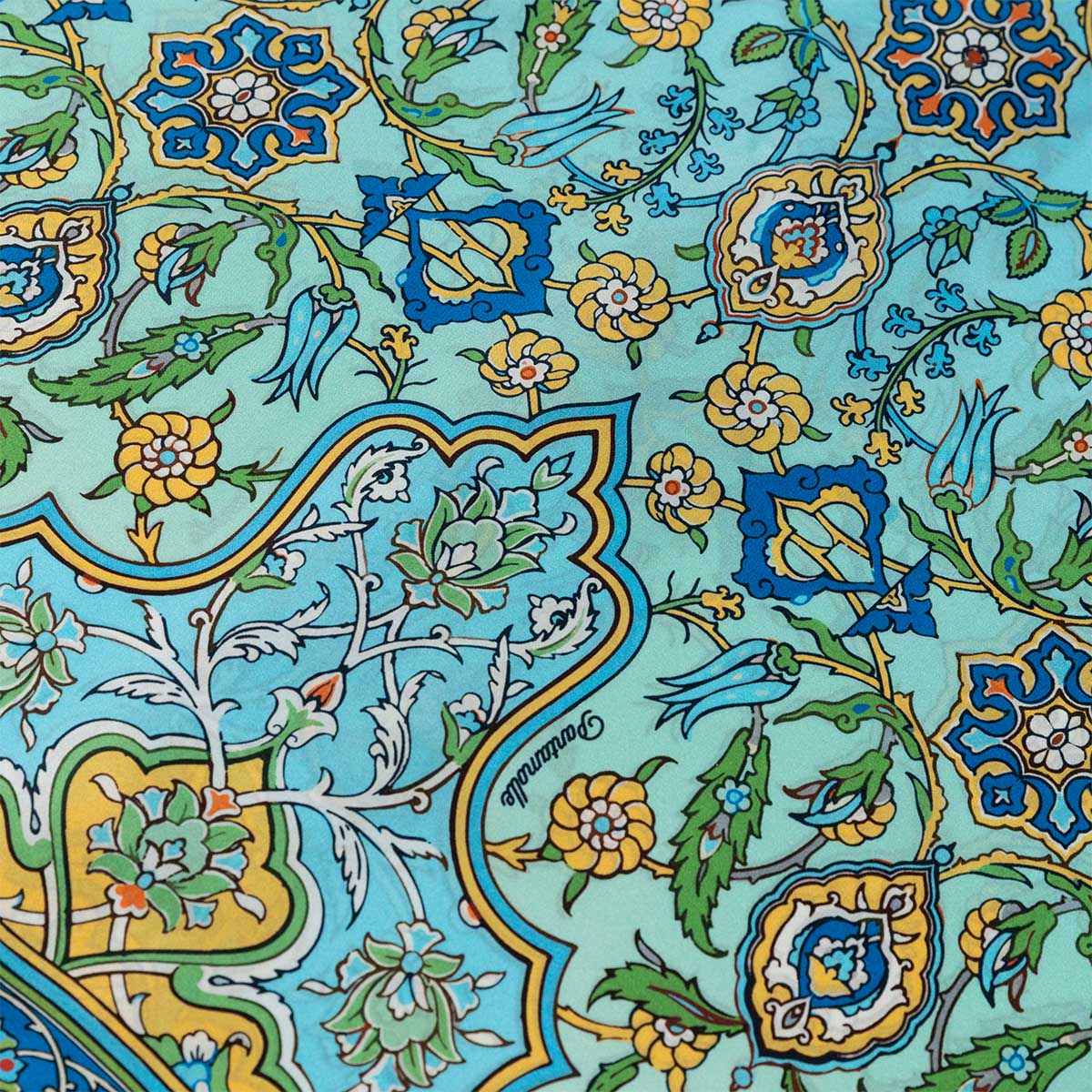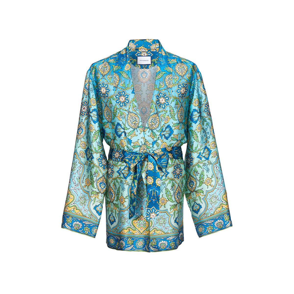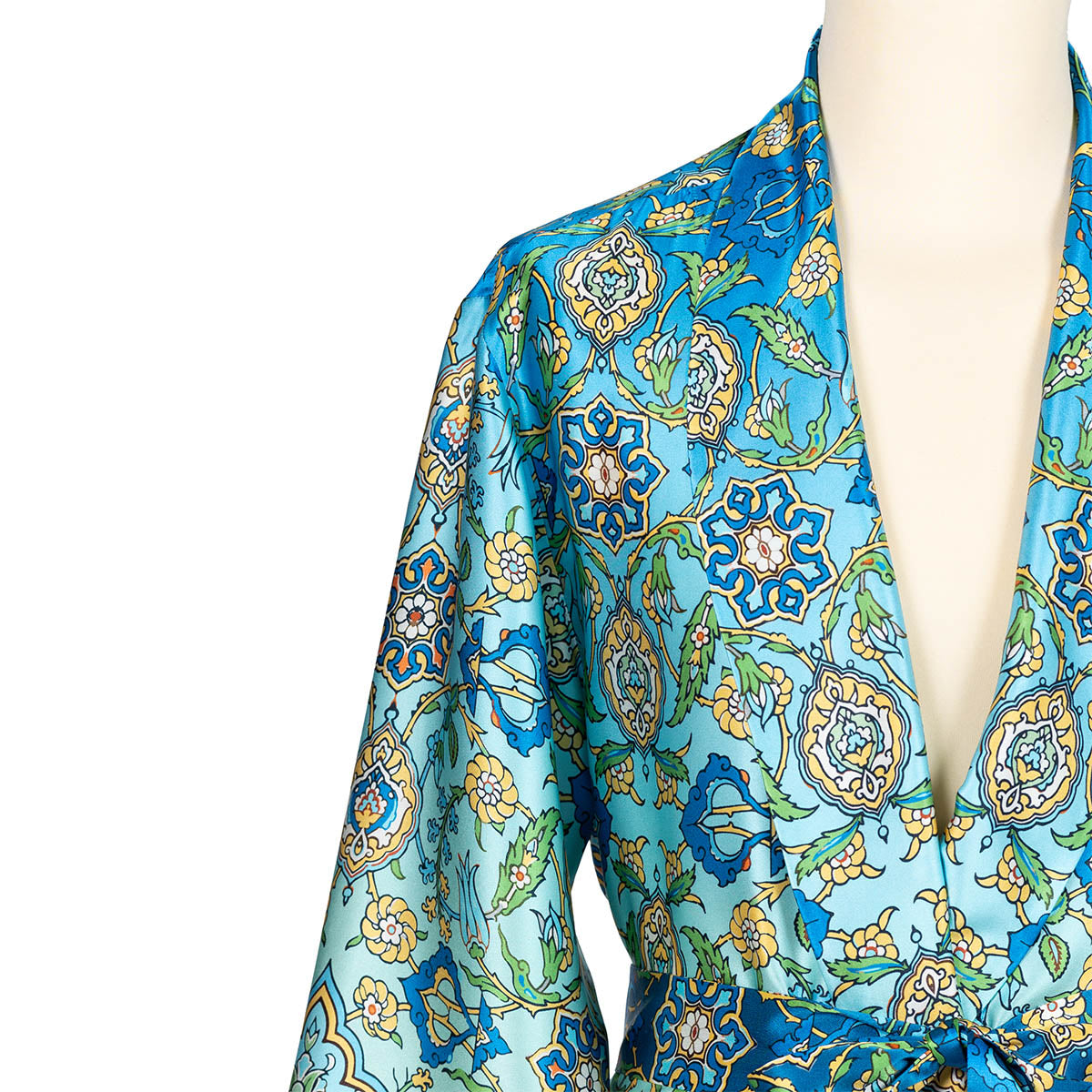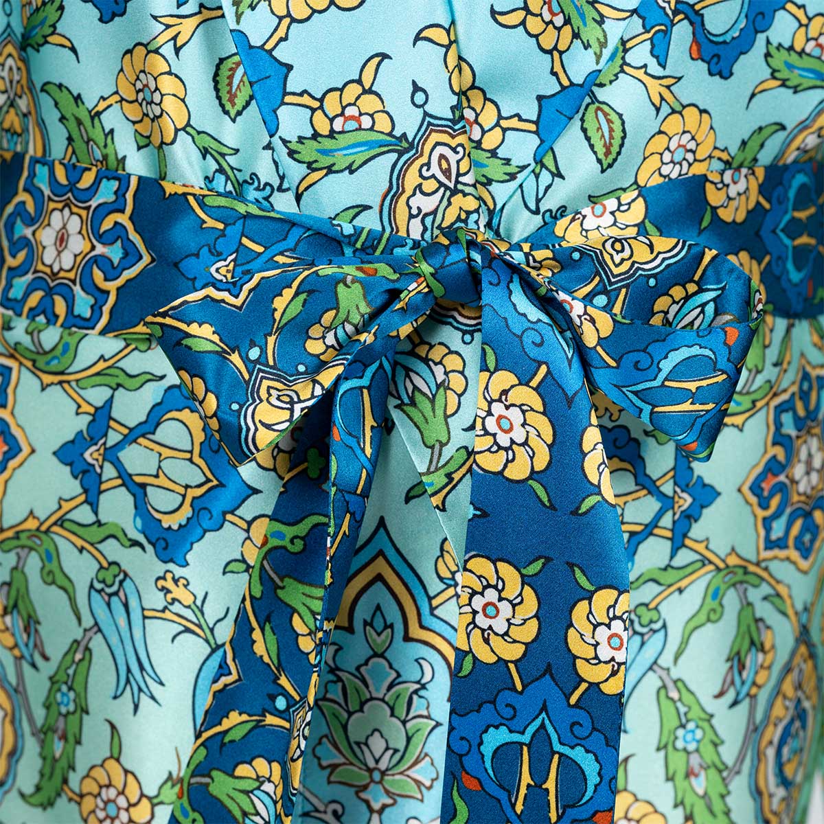 Realizzato con un esclusivo raso in seta, questo capo è animato dal nuovo design Stimarol: una greca arabeggiante è il punto di partenza di un intreccio geometrico che ricrea un pattern continuo e raffinato.