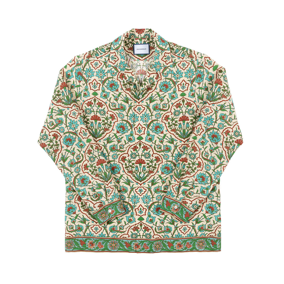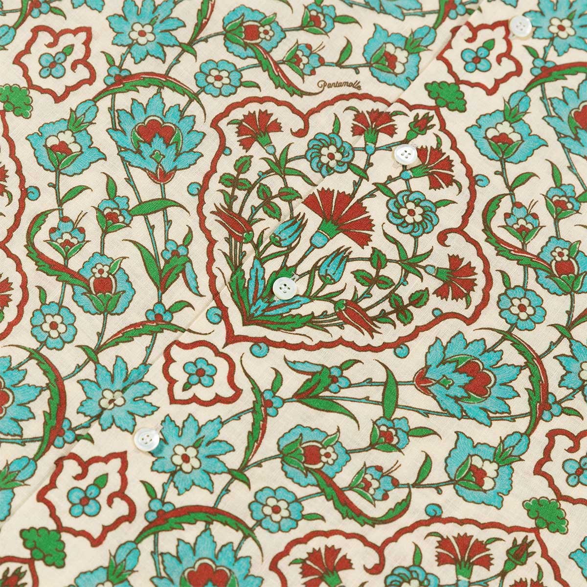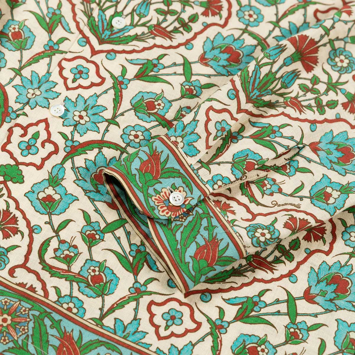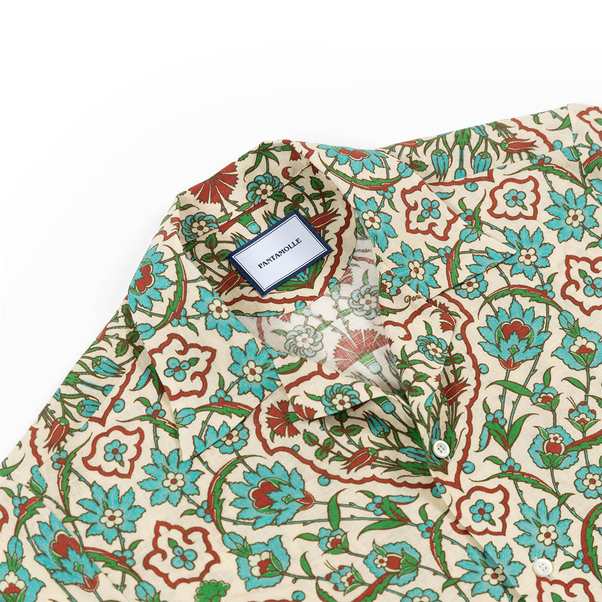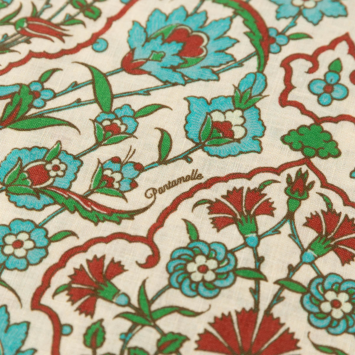 Realizzato con un confortevole lino, questo capo è animato dal nuovo design Sketes. Bouquet floreali, intrecci di arbusti ed elementi geometrici si uniscono per creare un pattern sofisticato ed elegante.