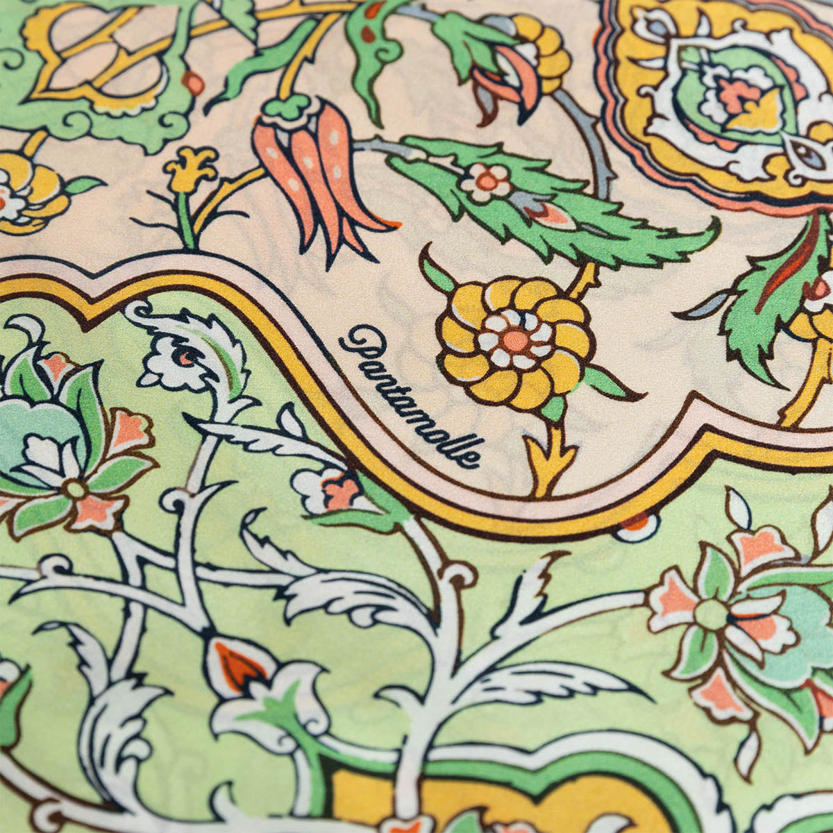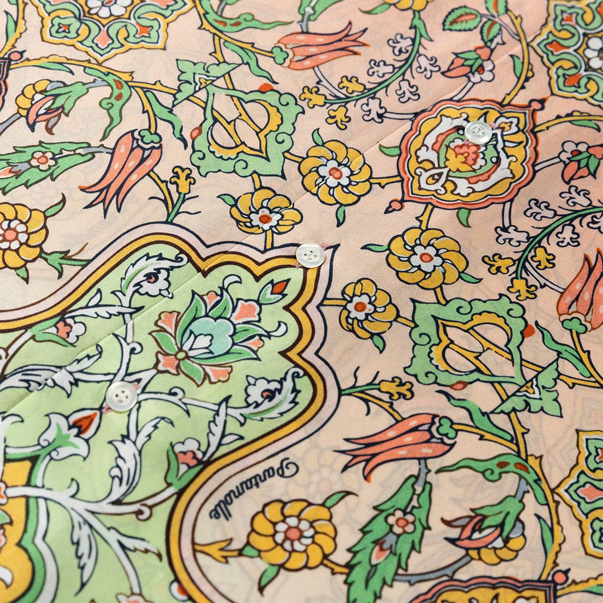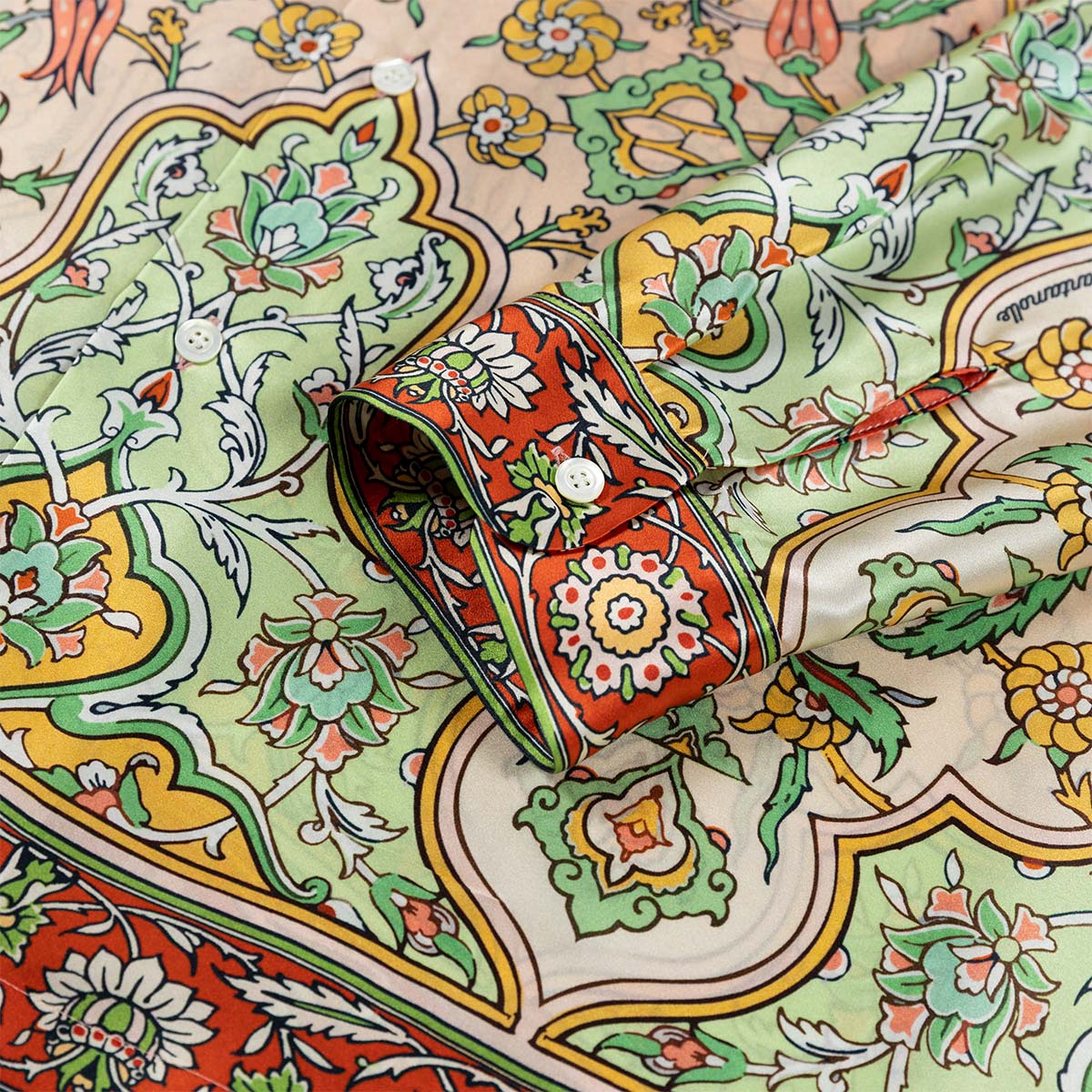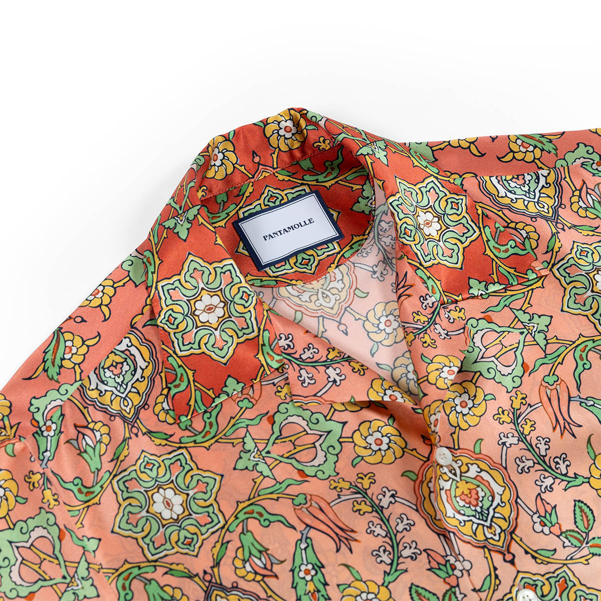 Realizzata con un esclusivo raso in seta, questa camicia è animata dal nuovo design Stimarol: una greca arabeggiante è il punto di partenza di un intreccio geometrico che ricrea un pattern continuo e raffinato.