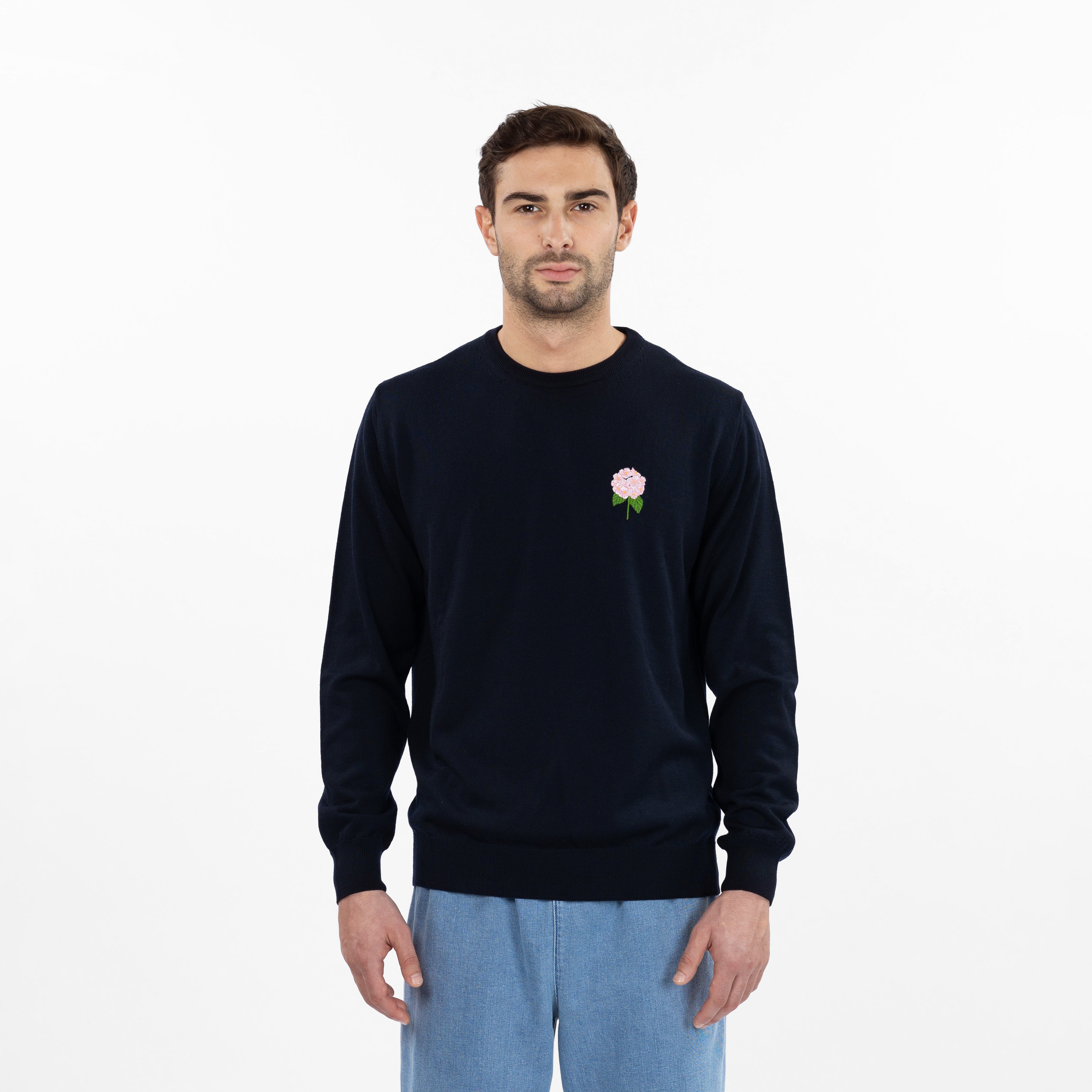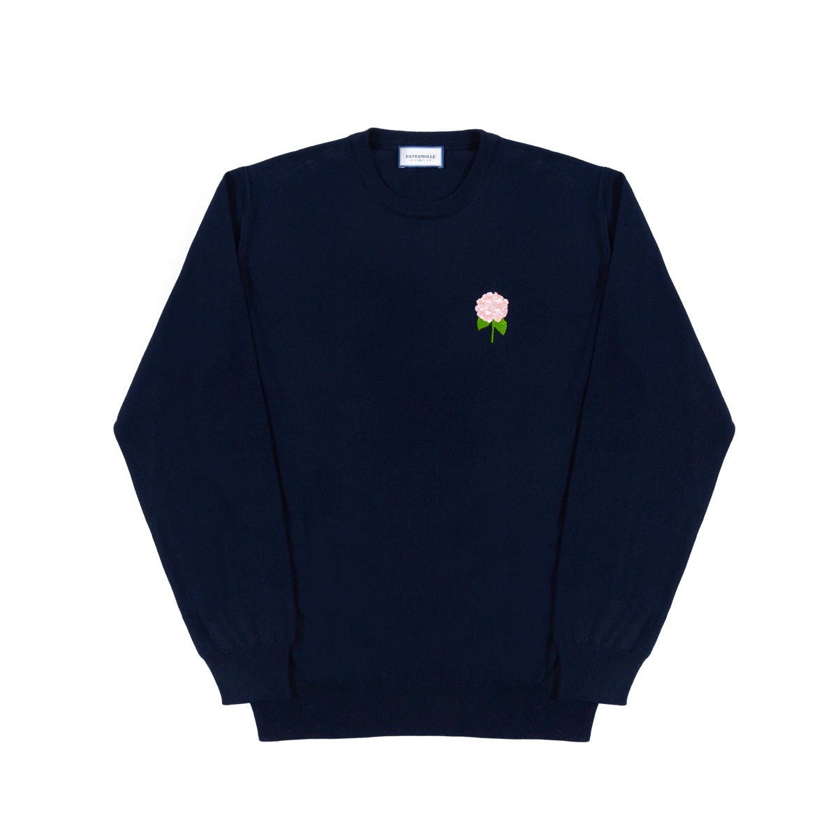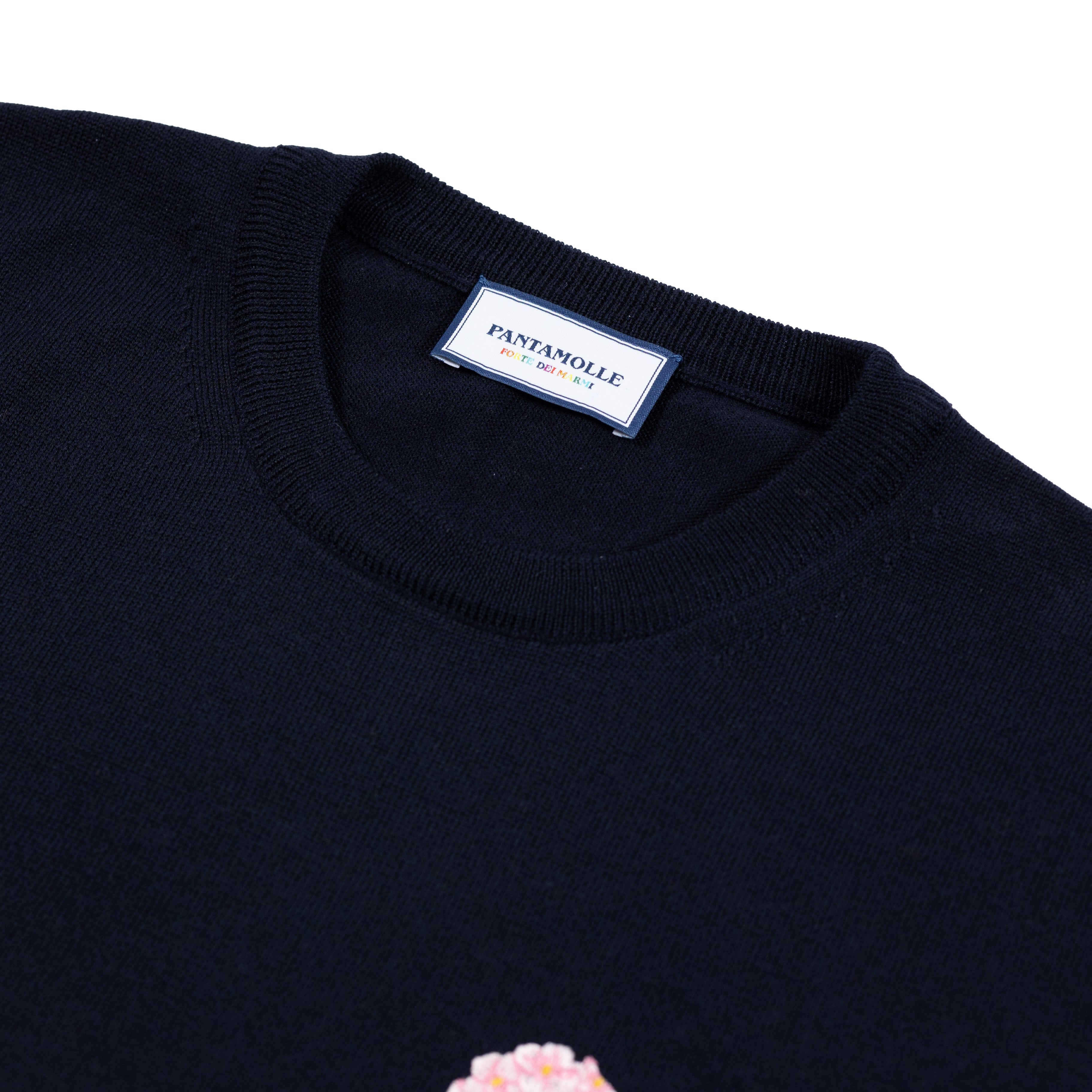 Realizzato con una fine triplofilo in lana merino, questo maglione capo presenta una vestibilità regolare ed è arricchito dall'iconico ricamo ortensia di Pantamolle.