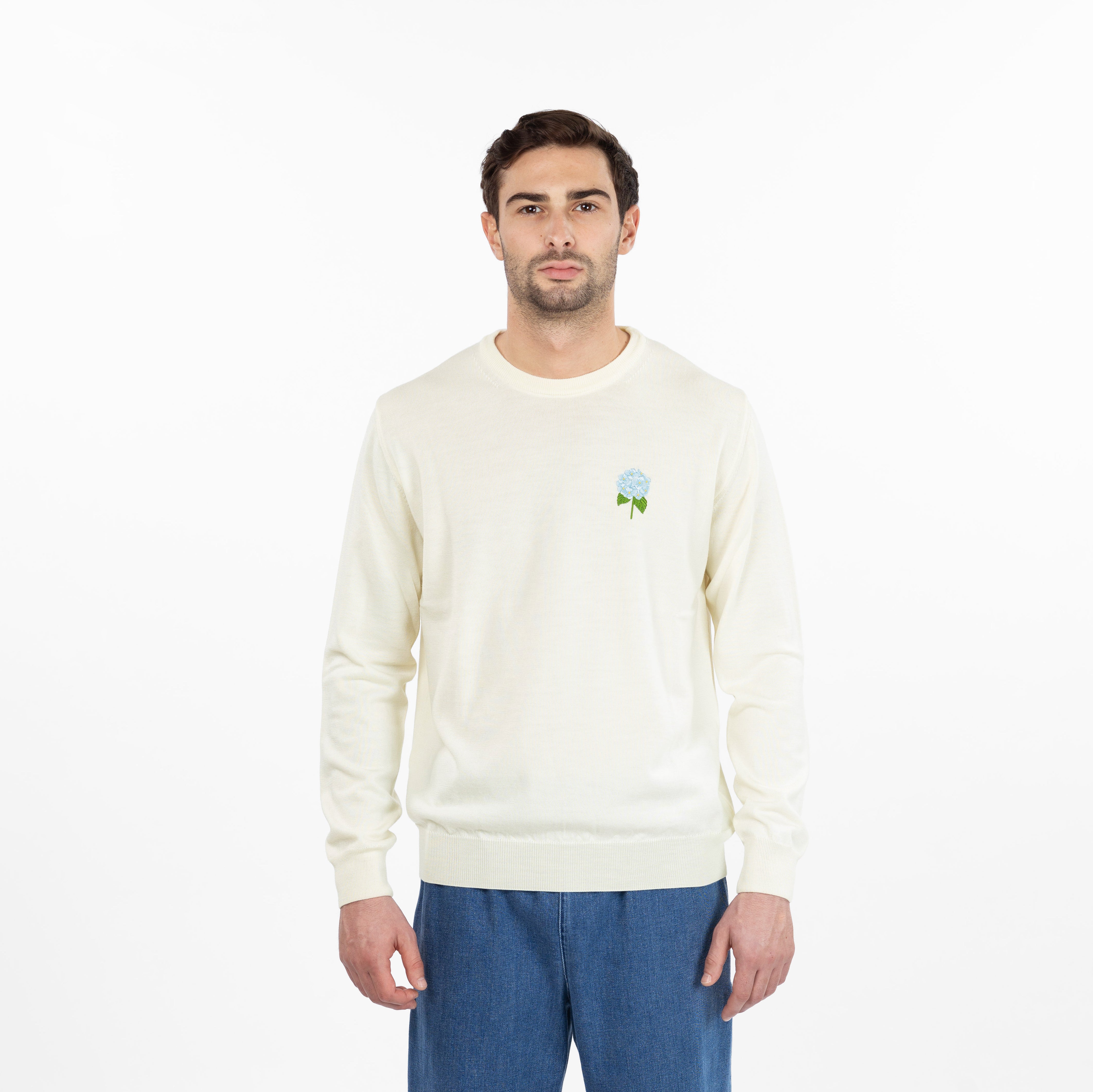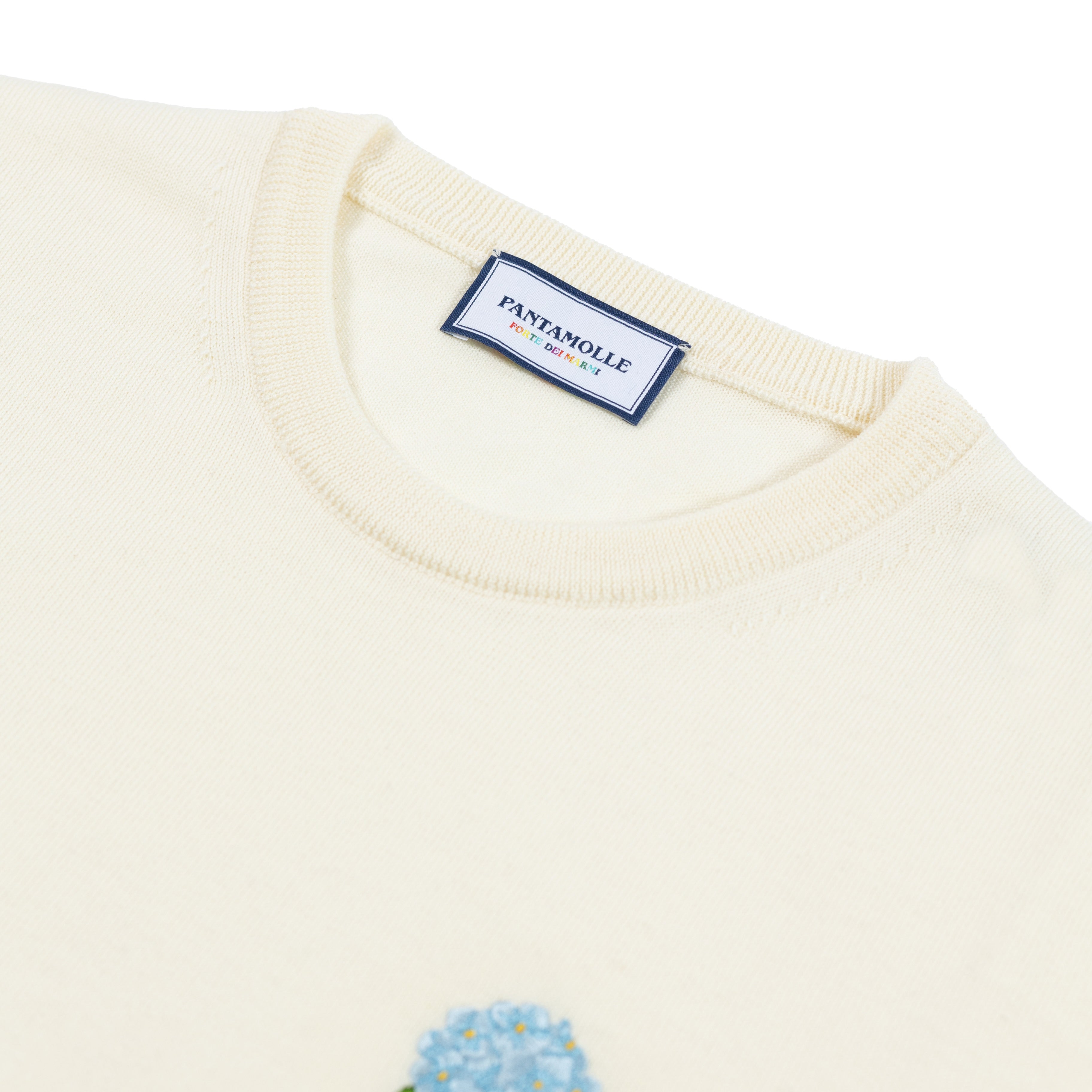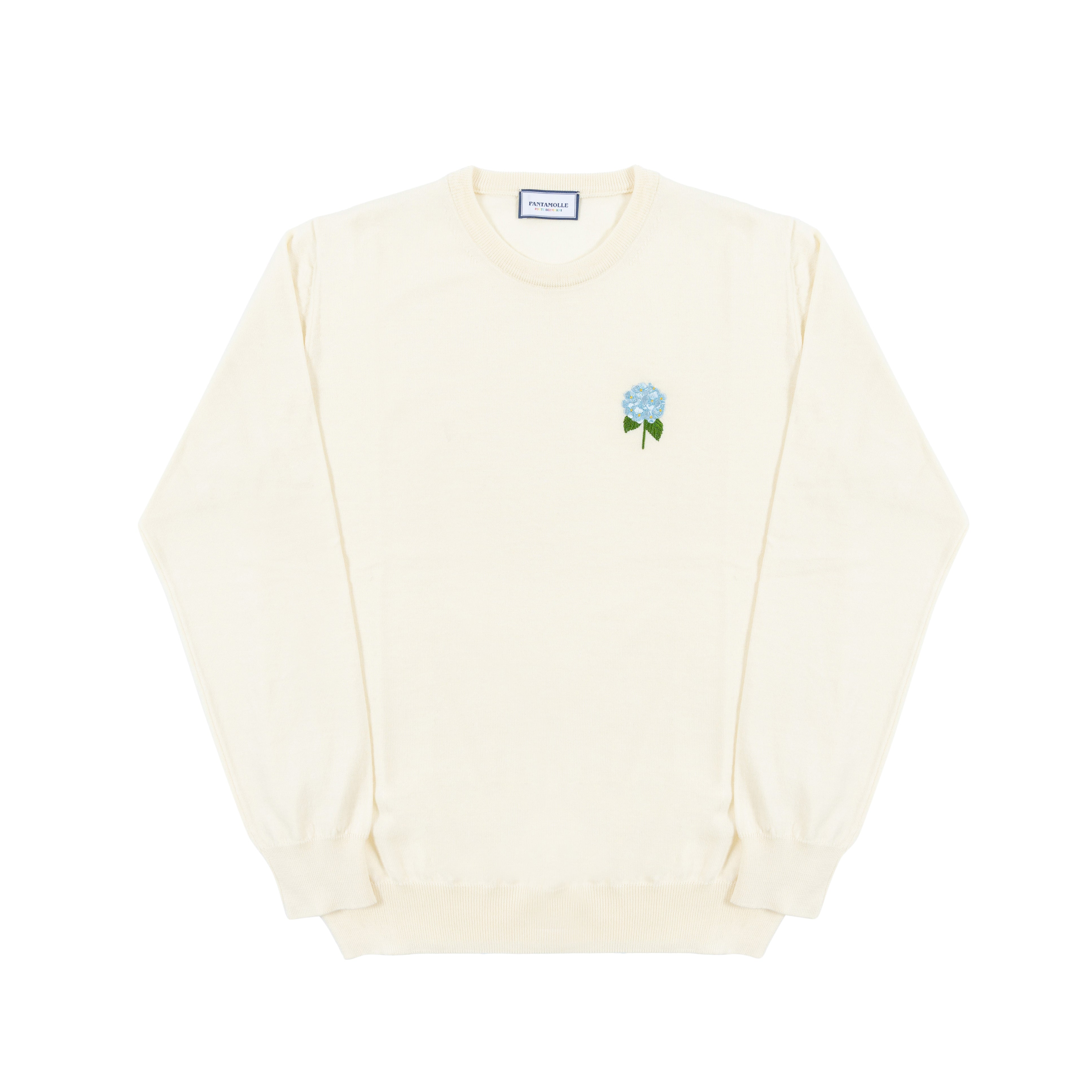 Realizzato con una fine triplofilo in lana merino, questo maglione capo presenta una vestibilità regolare ed è arricchito dall'iconico ricamo ortensia di Pantamolle.