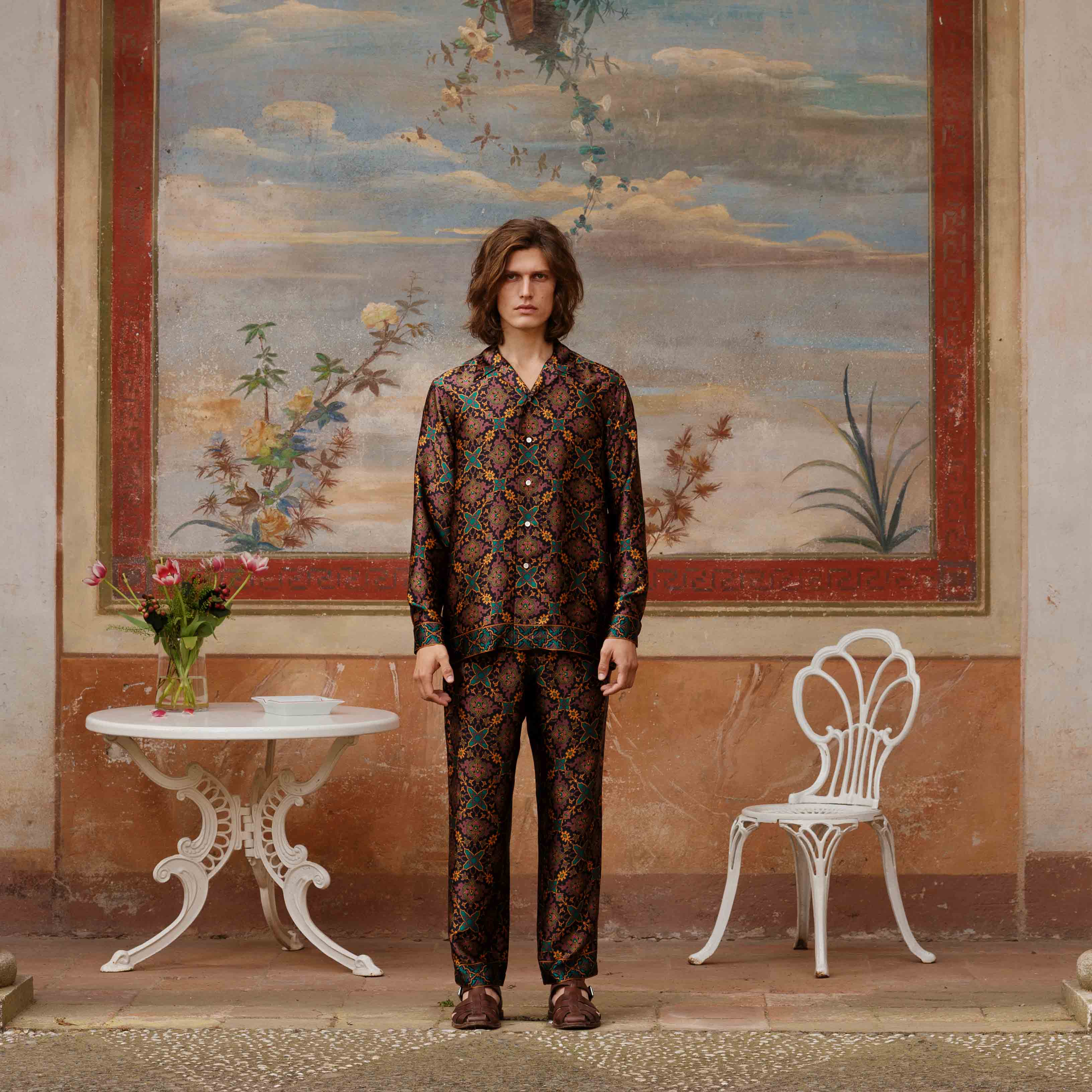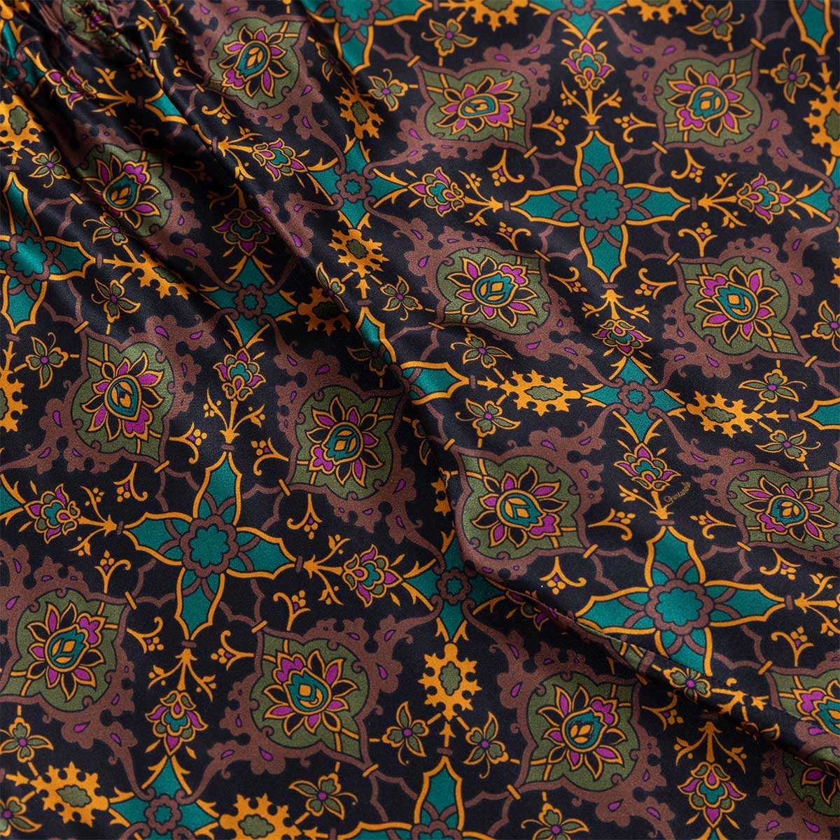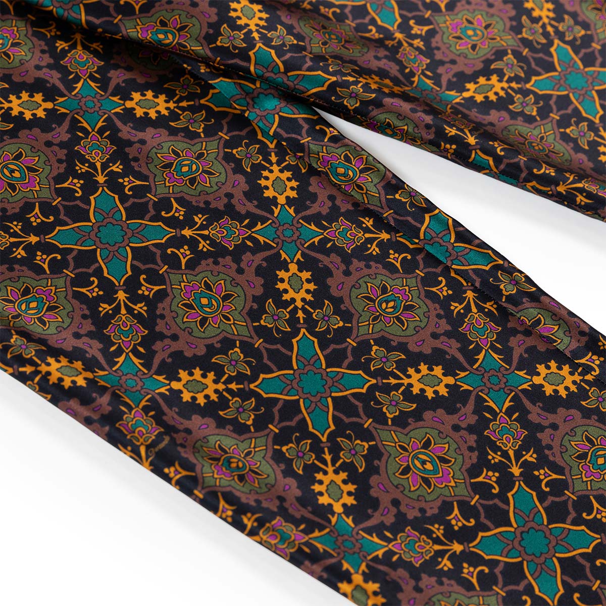 Realizzato con un esclusivo raso in seta, questo capo è animato dal nuovo design Gajardo: elementi geometrici si ripropongono con simmetria e precisione creando una fantasia semplice e raffinata.