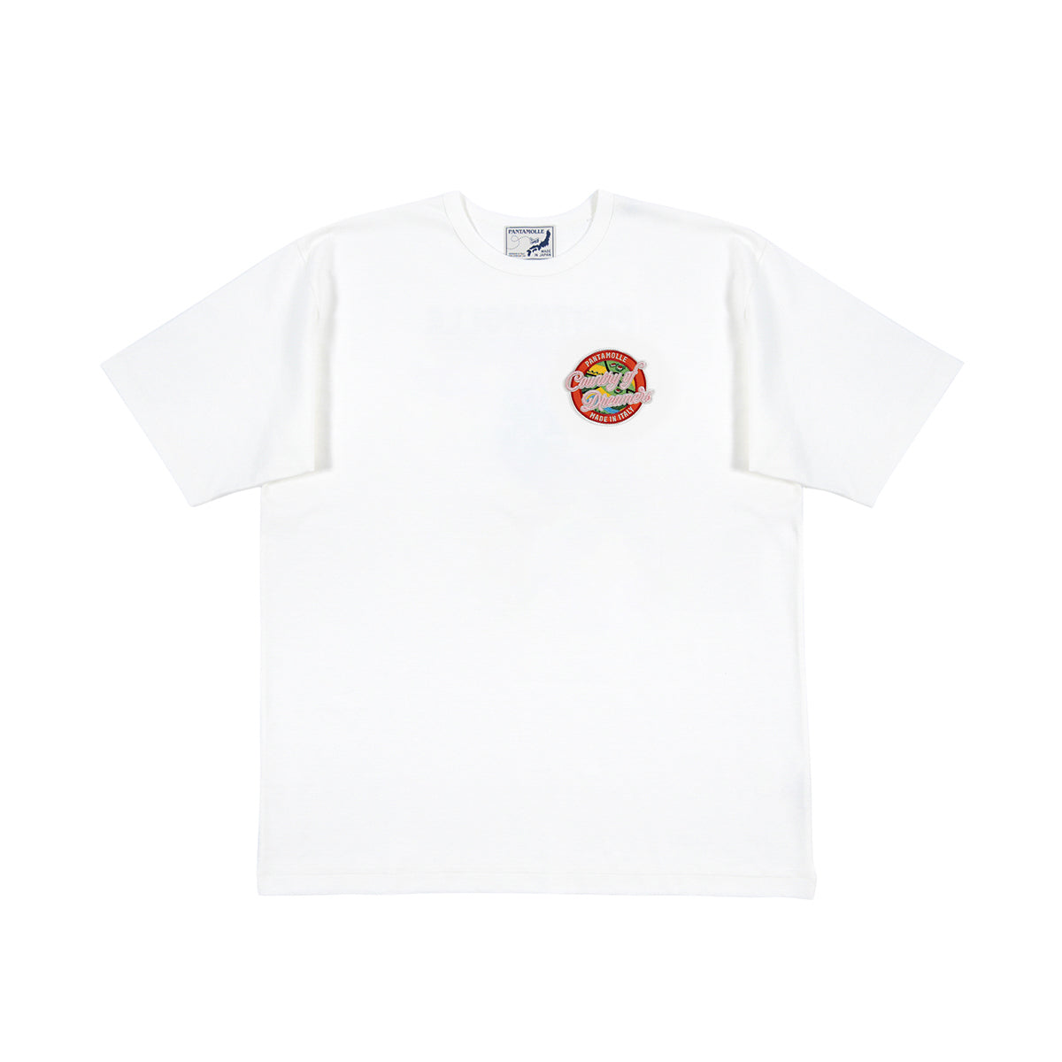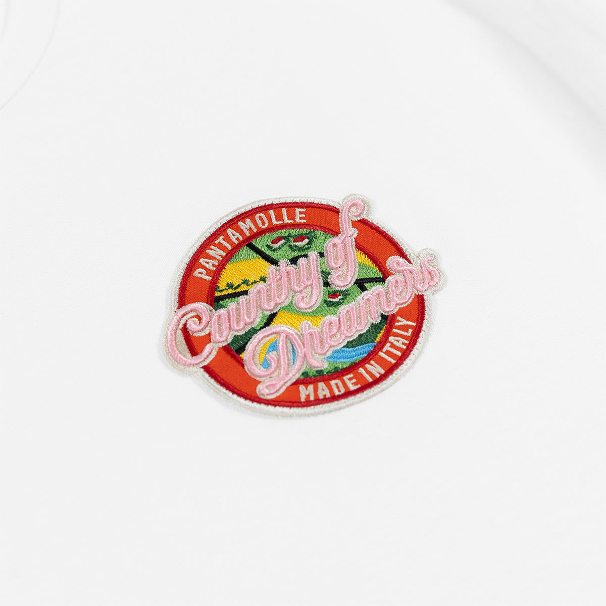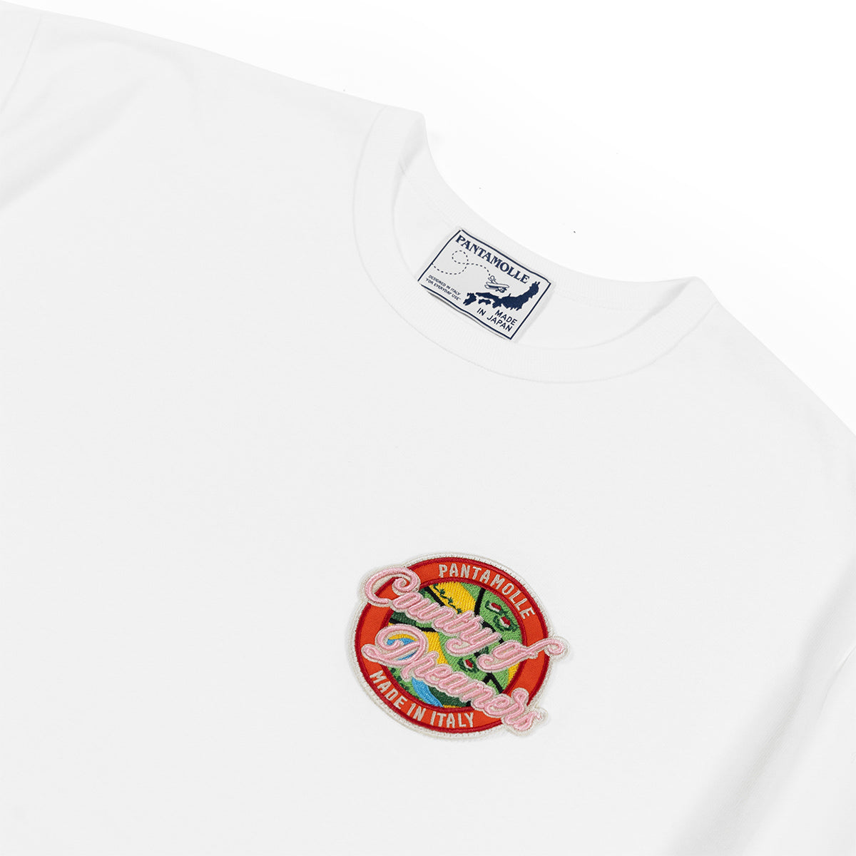 Per la nuova collezione SS25 Pantamolle sperimenta ricami e patch per arricchire una serie di nuovi capi ready-to-wear. Realizzata con un esclusivo jersey giapponese, questa t-shirt celebra l'Italia: Country of Dreamers.
