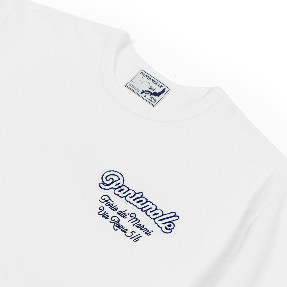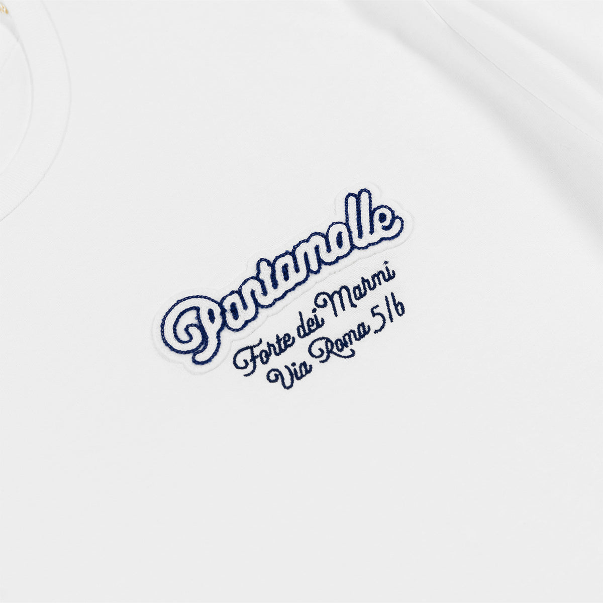 Per la nuova collezione SS25 Pantamolle sperimenta ricami e patch per arricchire una serie di nuovi capi ready-to-wear. Realizzata con un esclusivo jersey giapponese, questa t-shirt celebra il nostro iconico store di Forte dei Marmi.