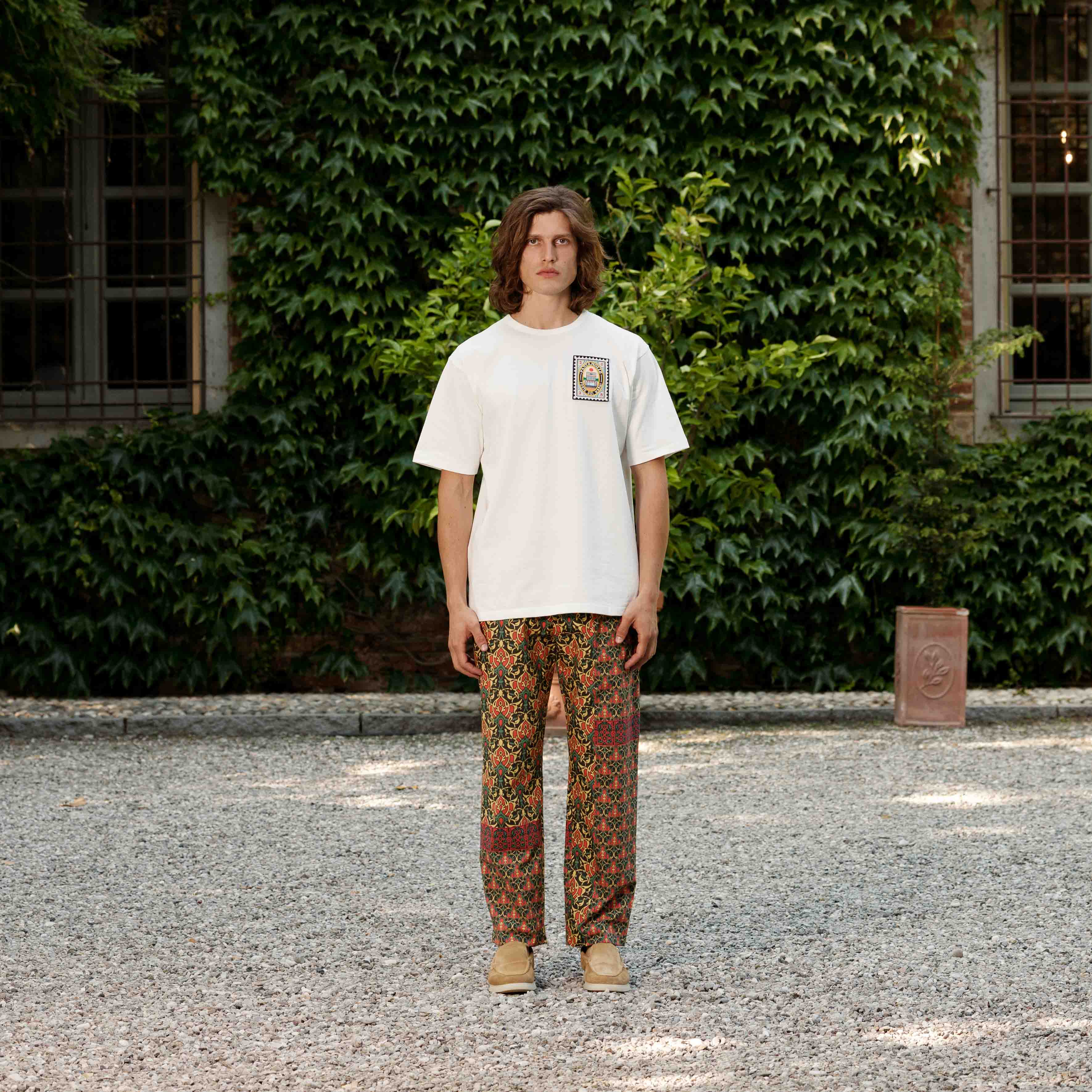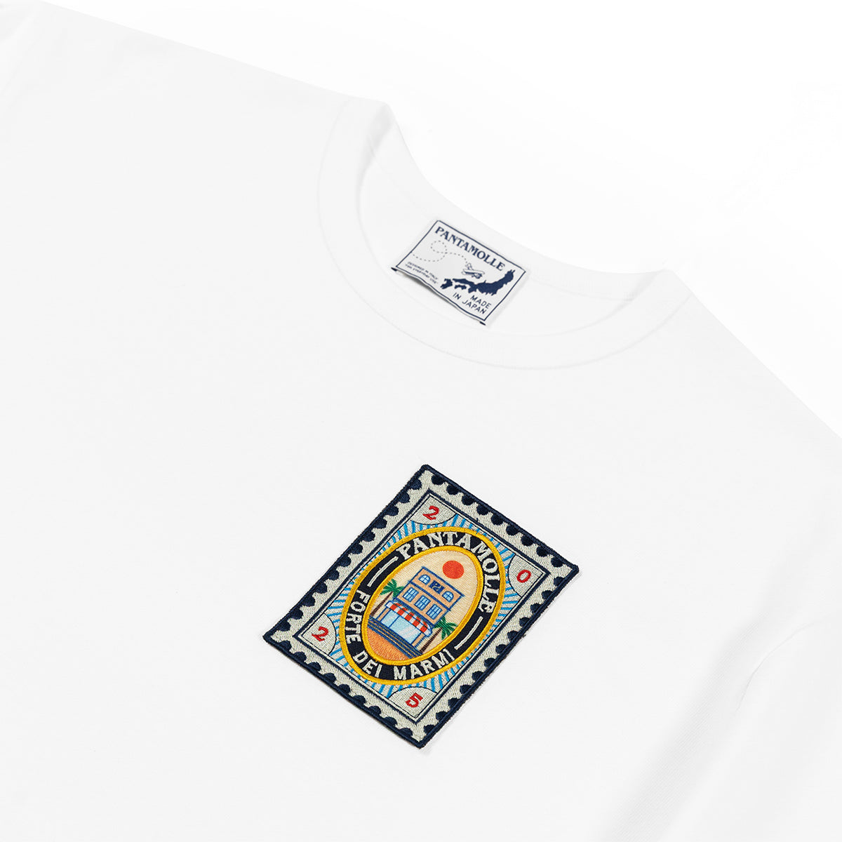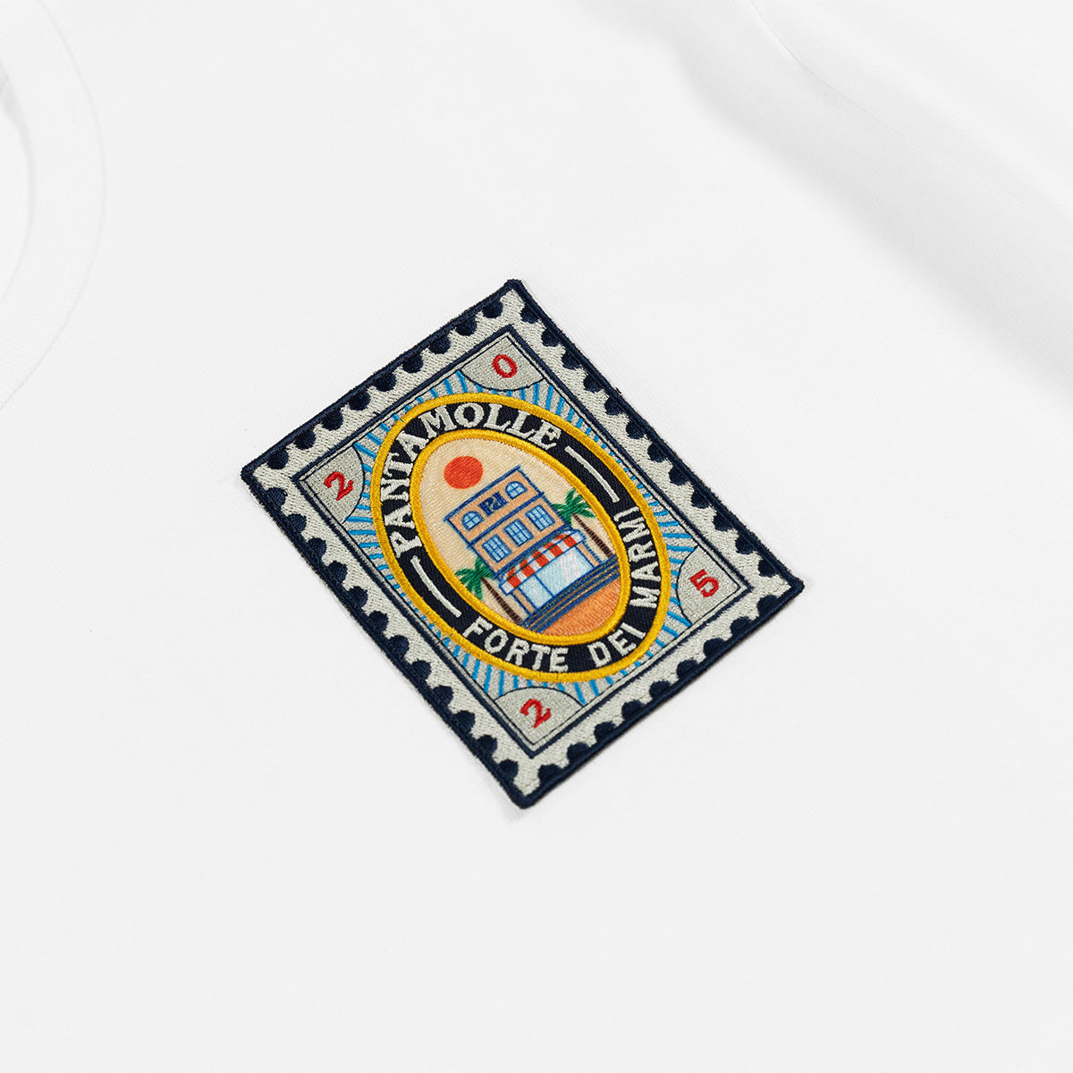 Per la nuova collezione SS25 Pantamolle sperimenta ricami e patch per arricchire una serie di nuovi capi ready-to-wear. Realizzata con un esclusivo jersey giapponese, questa t-shirt celebra il nostro iconico store di Forte dei Marmi.